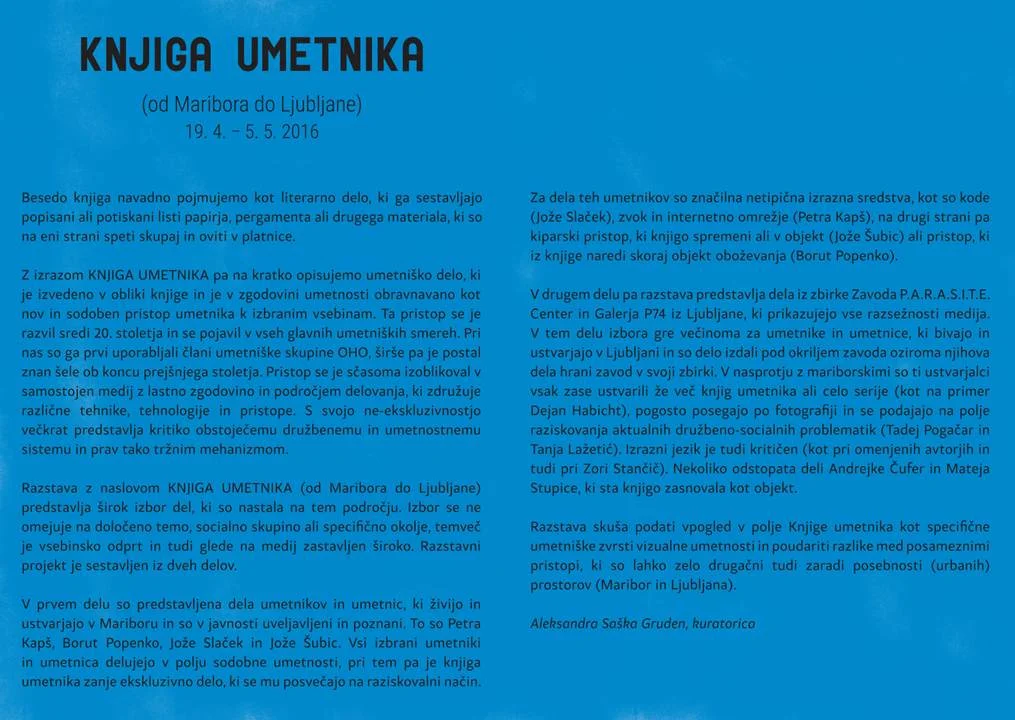 Razstava z naslovom KNJIGA UMETNIKA (od Maribora do Ljubljane) predstavlja širok izbor del, ki so nastala na tem področju. Izbor se ne omejuje na določeno temo, socialno skupino ali specifično okolje, temveč je vsebinsko odprt in tudi glede na medij zastavljen široko. Razstavni projekt je sestavljen iz dveh delov.